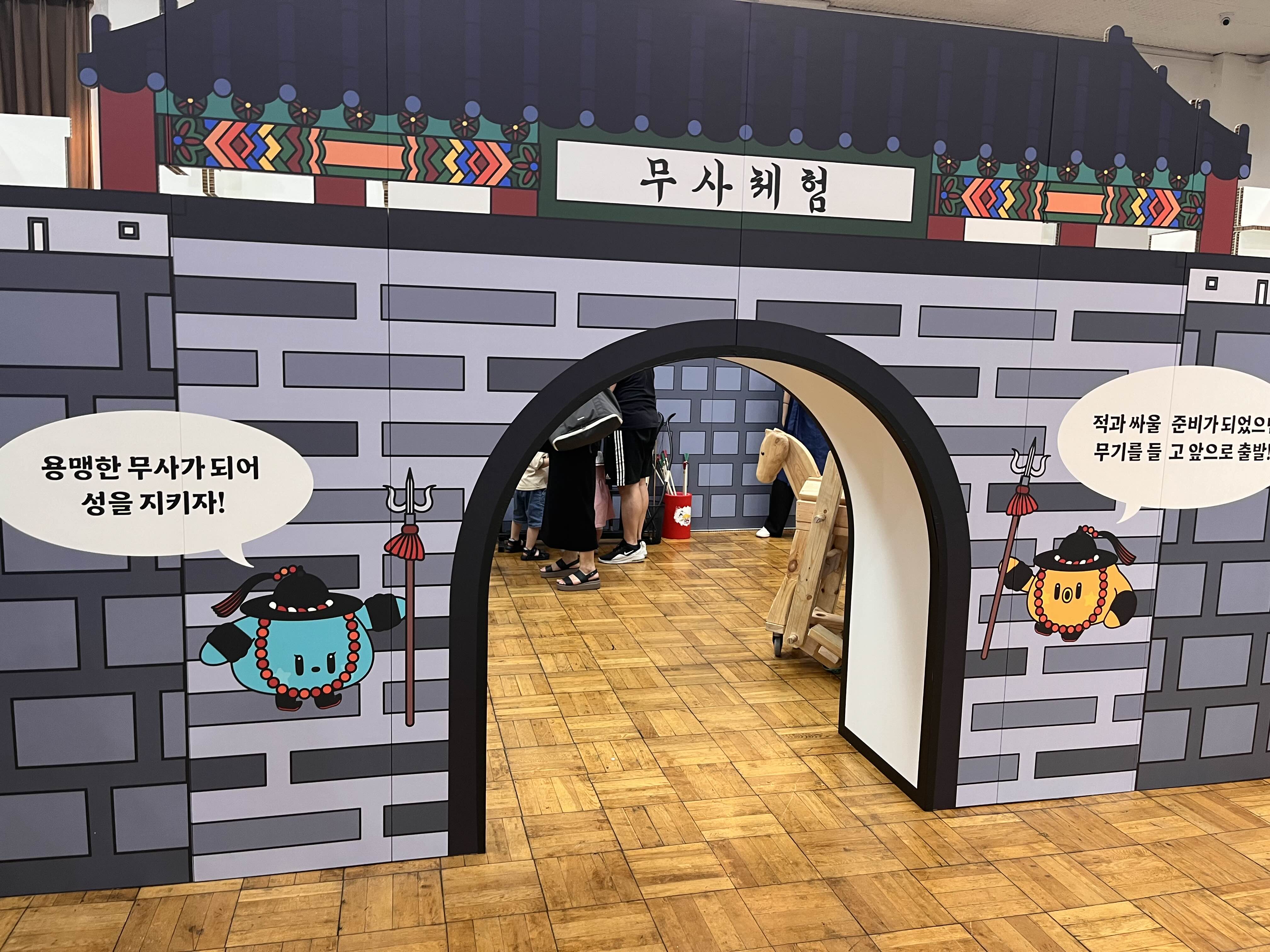 한복입어보는 체험이 있었는데, 키가 작은 영유아는 너무 커서 입을 만한게 없었다ㅠㅠ 둘째가 하고 싶다해서 갔다가 저고리만 입고 찍음ㅠㅠㅠ 가채도 있어서 재밌어 보였는데, 그건 무거워서 유아가 쓰기는 어렵다고 하셨다. 무사 체험을 하는 곳은 투구나 갑옷을 입어 볼 수 있었고, 그 외에도 산가지 놀이, 고누 놀이를 배워보고 할 수 있는 곳도 있었다. 어떤 곳은 이런 전통 놀이를 부모가 읽고 가르쳐줘야되서 헷갈릴 때가 있는데 여기서는 어르신들이 자리에 앉아서 같이 게임을 해 주셔서 더 좋아보였다. 그렇지만 시간 상 다 하지는 못하고 왔다.