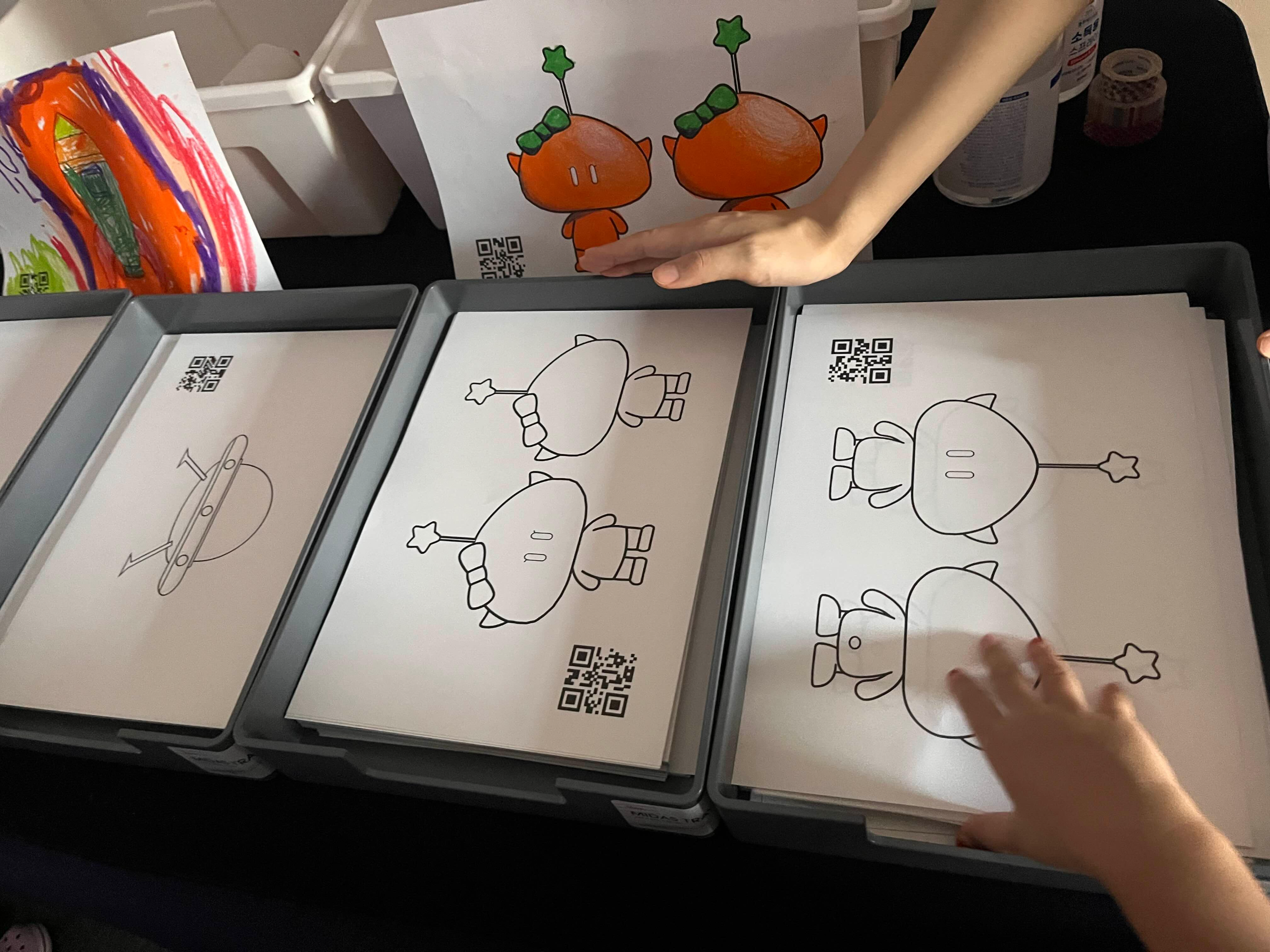 + 꿈돌이 꿈순이가 한장에 같이 있는 줄알았는데, 알고 보이 앞/뒤를 꾸미는 거였다. 그러면 스캔해서 꿈순이가 빙글빙글 돌 때 앞/뒤가 다 나오는거다. 우리애들은 그냥 꿈순이 두명인줄 알고, 뒷모습에 눈까지 그려서 색칠했는데, 영상에는 한명만 나와서 없어진 줄알고 슬퍼했다 ㅋㅋㅋ 다시해야 한다고 우기는거 겨우 꼬셔서 데리고 나왔다.