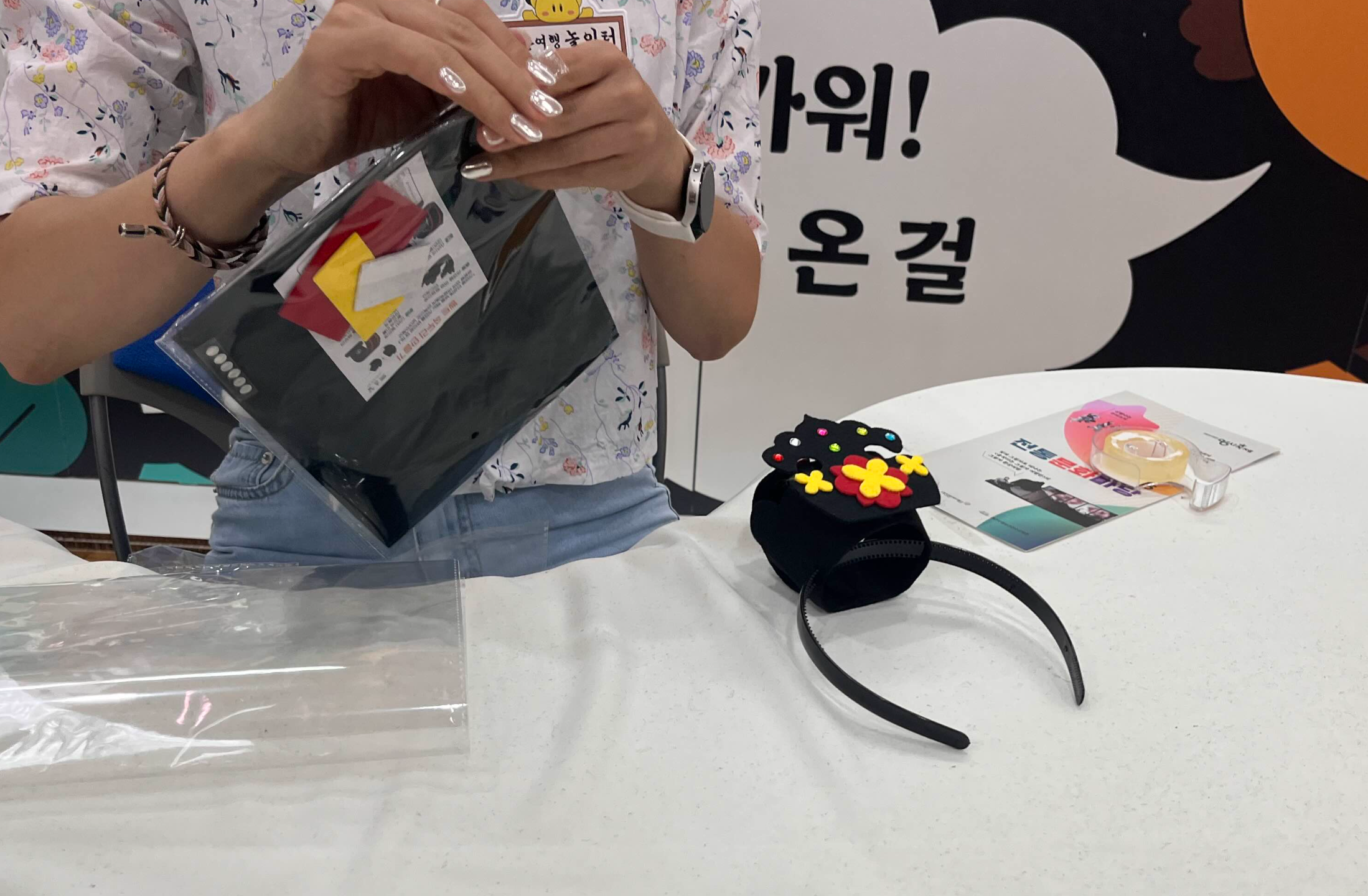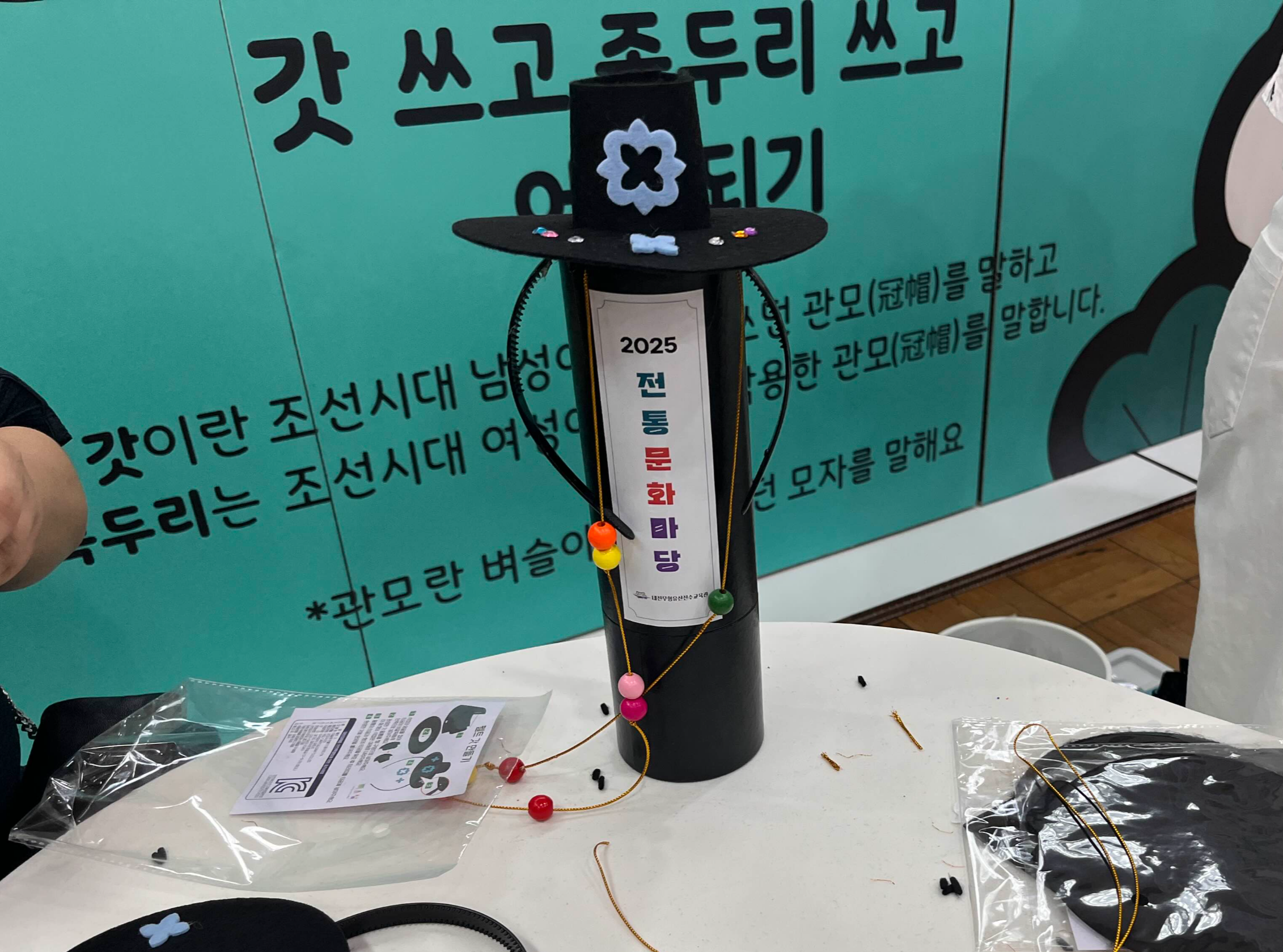 입구 쪽에는 바람개비 태극기 만들기가 있었고, 안쪽으로 들어오면 두 테이블에 족두리 만들기, 갓만들기가 있었다.