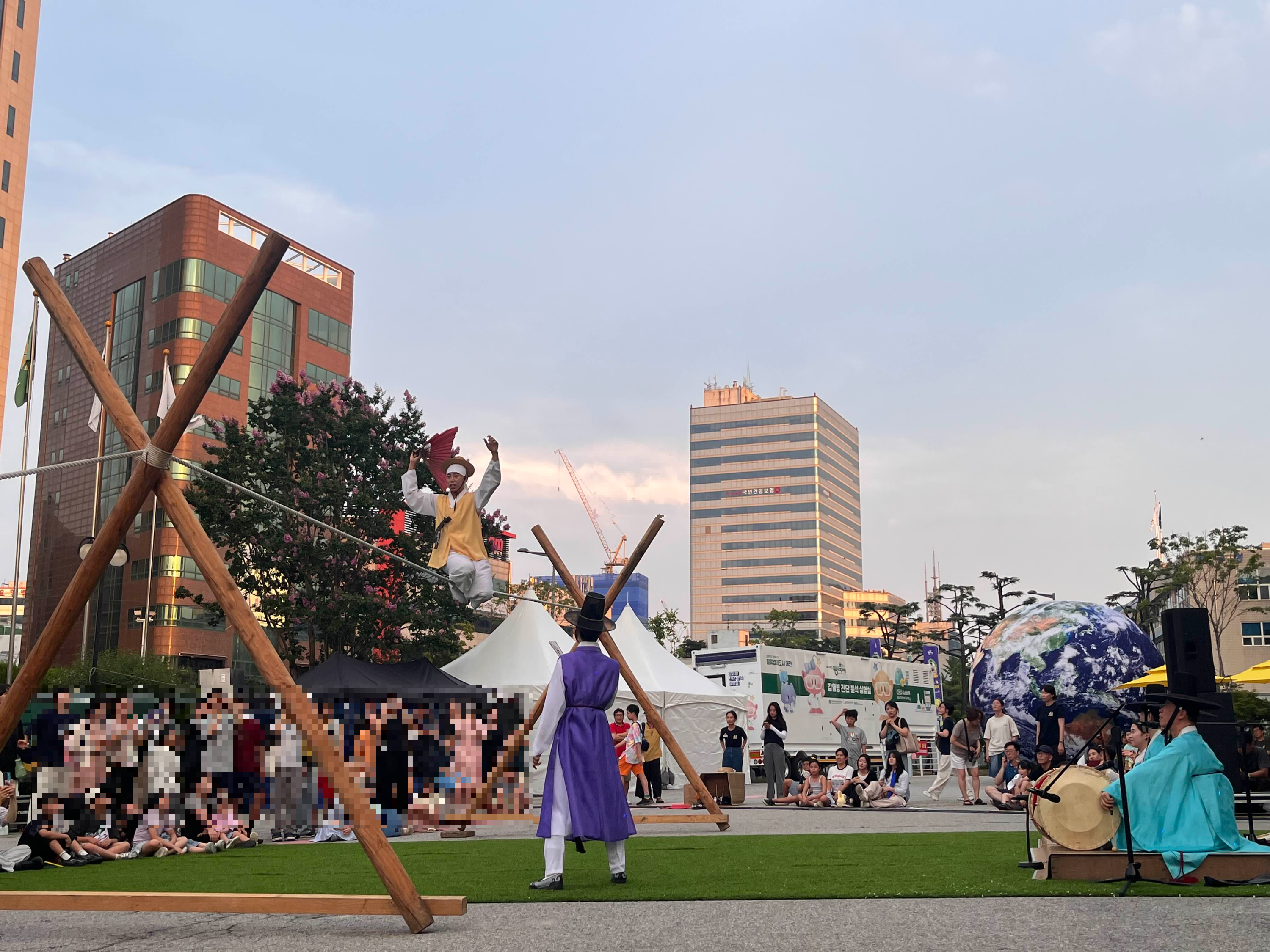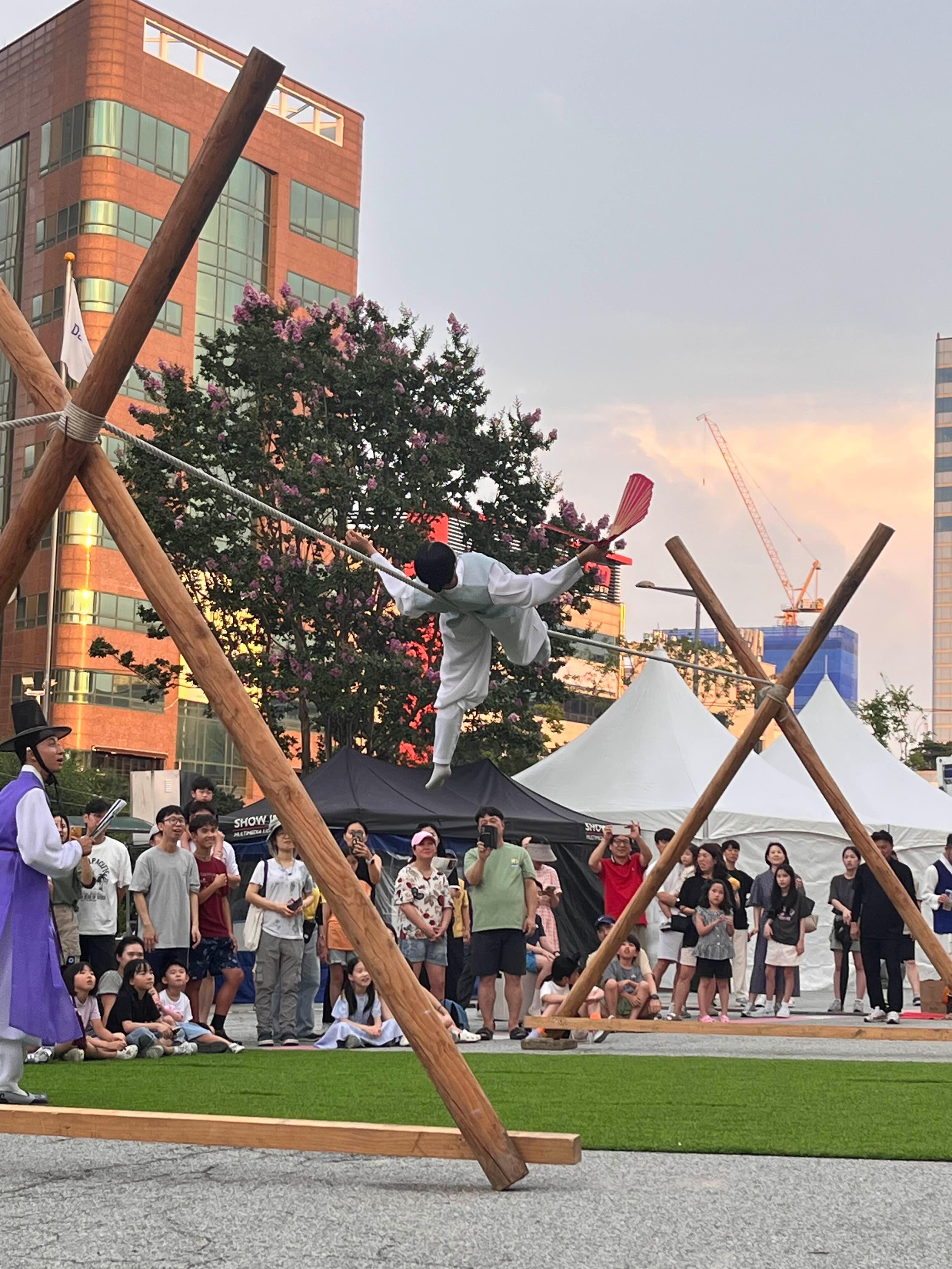 다섯시에 한 서커스는 더워서 포기하고, 6시에 농악놀이 6시 30분에 줄타기를 봤다. 건물 안쪽에 의자가 있기는 했지만 밖에 앉아서 서 볼 수도 있었다. 바닥이 뜨겁긴했는데 해가 없어서 덜 더웠다. 애들도 재미있었는지 거의 한시간을 꼬박 잘 보고 나왔다(간식이랑 물을 먹어가면서 보기는 함 ㅋㅋㅋ그냥 봤으면 중간에 집에가자했을듯 ㅎㅎ).