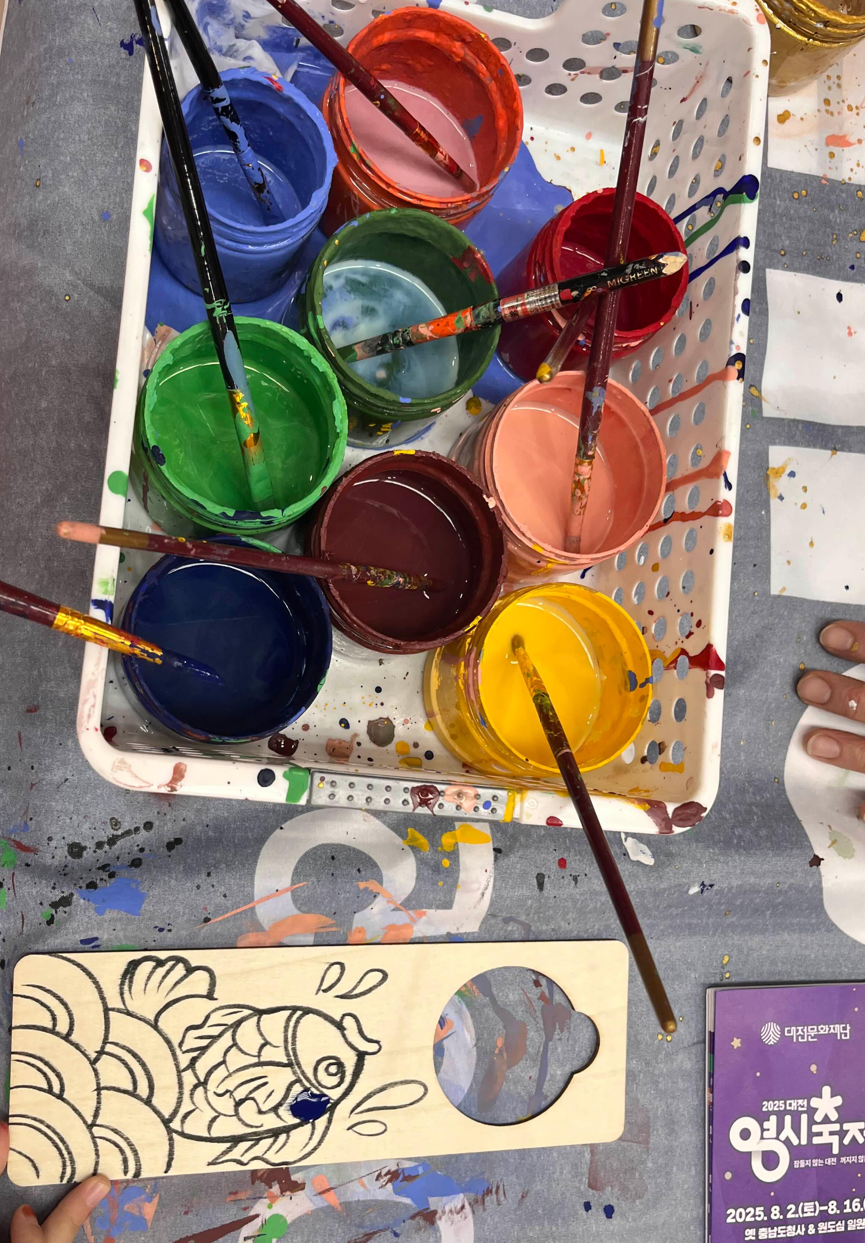 전문가분께서 나비랑 꽃 또는 물고기 중에 어떤 그림을 하고 싶은지 물어보신다. 슥슥 밑그림을 그려주시면 아이들이 앉아서 칠하면 되고, 다 칠한 후에는 흰색, 금색으로 전문가스러운 터치를 해서 주신다(말리는 동안 다른 곳에 다녀오라고 하심).