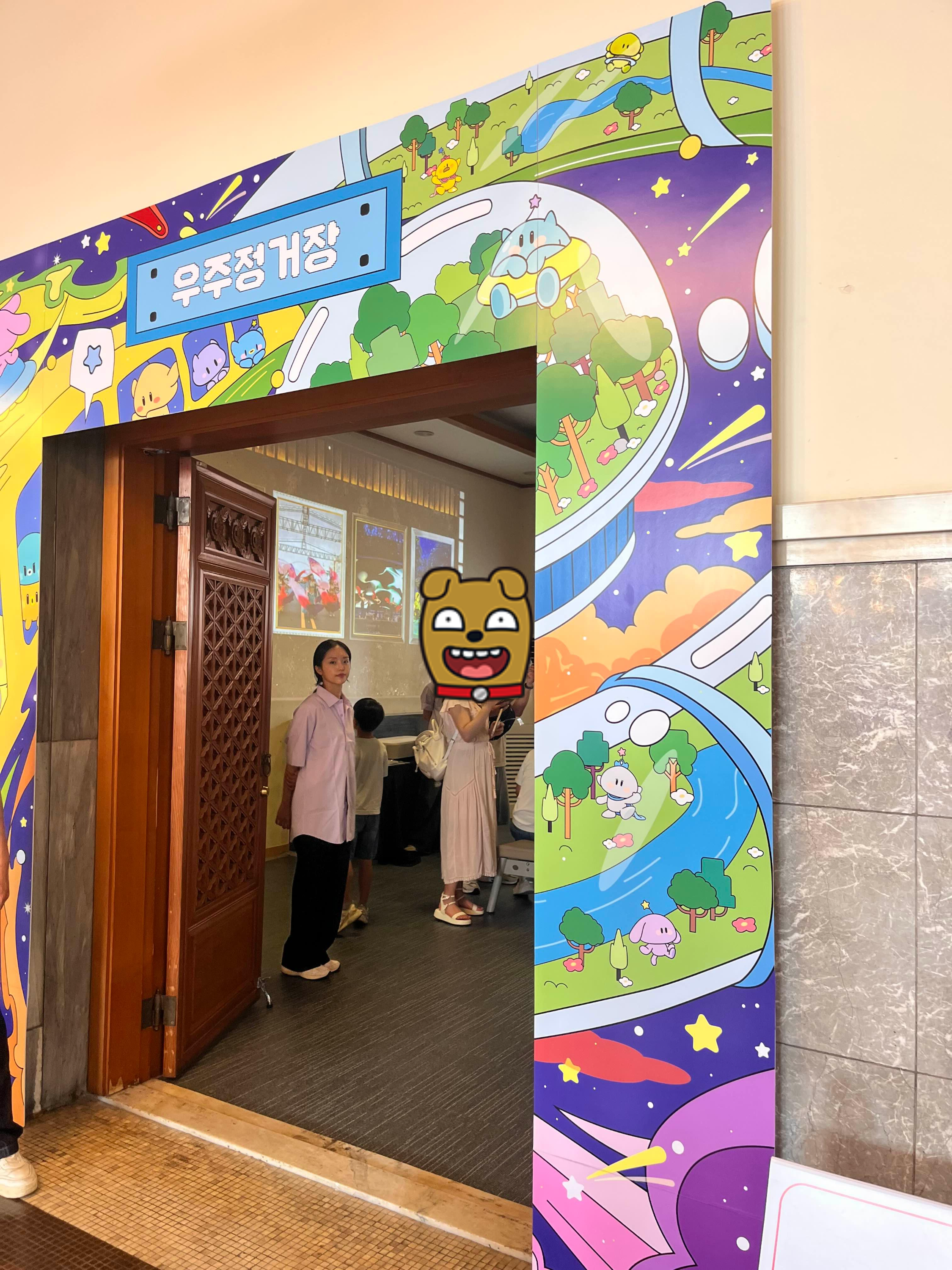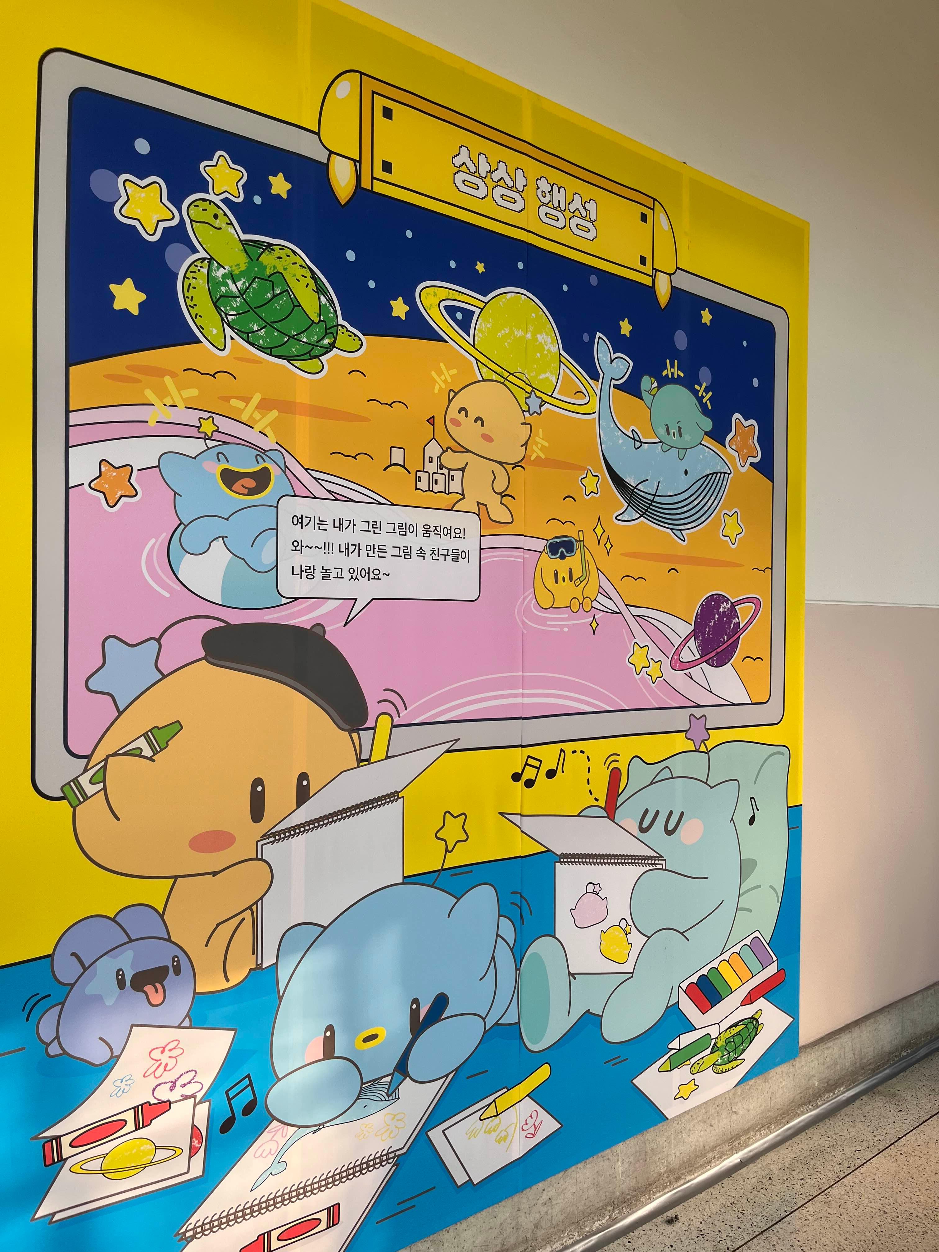 꿈돌이, 꿈순이, 우주선, 로케트 네 가지중에 골라서 색칠하고 스캔하면 벽에 내가 그린 그림이 나온다. 요즘 이러한 형식의 체험관은 많아서 나는 굳이 안해도 되는데... 싶었는데, 애들은 엄청 좋아했다 ㅎㅎㅎㅎ 사진은 밝게 나왔지만 어두운 배경에 애들이 좋아할만한 초코 행성들이 날아다니고 하니까 한참 구경을 했다.