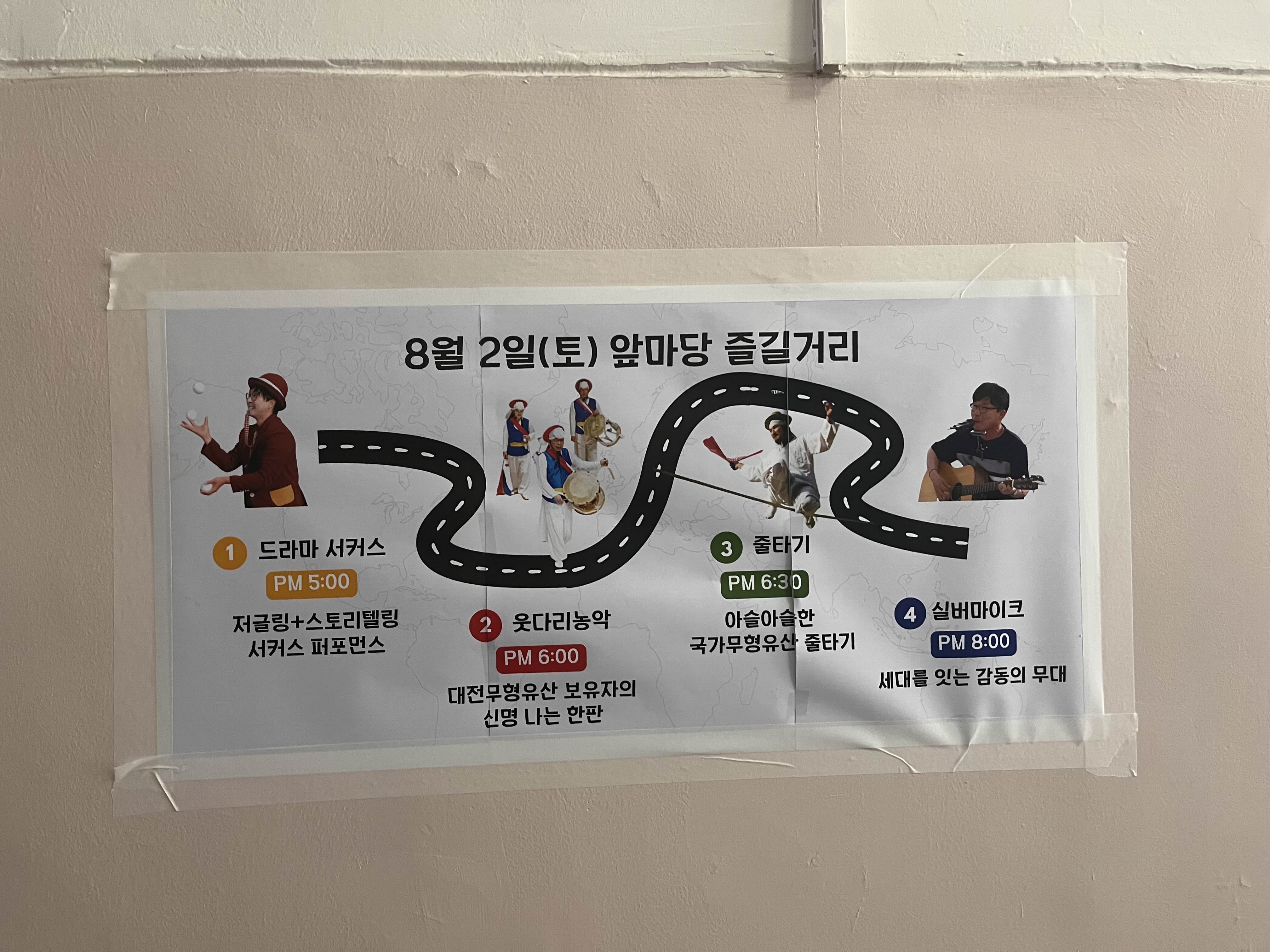 들어가면 입구 오른쪽부터 관람하라고 하시는데, 그쪽으로 돌면 유모차 주차해 놓는 곳이있다. 유모차를 밀고 다녀도 되기는 하지만 공간이 좀 좁아서 그런가보다. 벽에는 곳곳에 오늘 공연에 대한 홍보가 붙어 있었다. 5시부터 서커스를 한다고 되어 있기는 하지만, 너무 더울 것 같아서 6시쯤에 있는 농악놀이랑, 줄타기까지 보고 왔다.